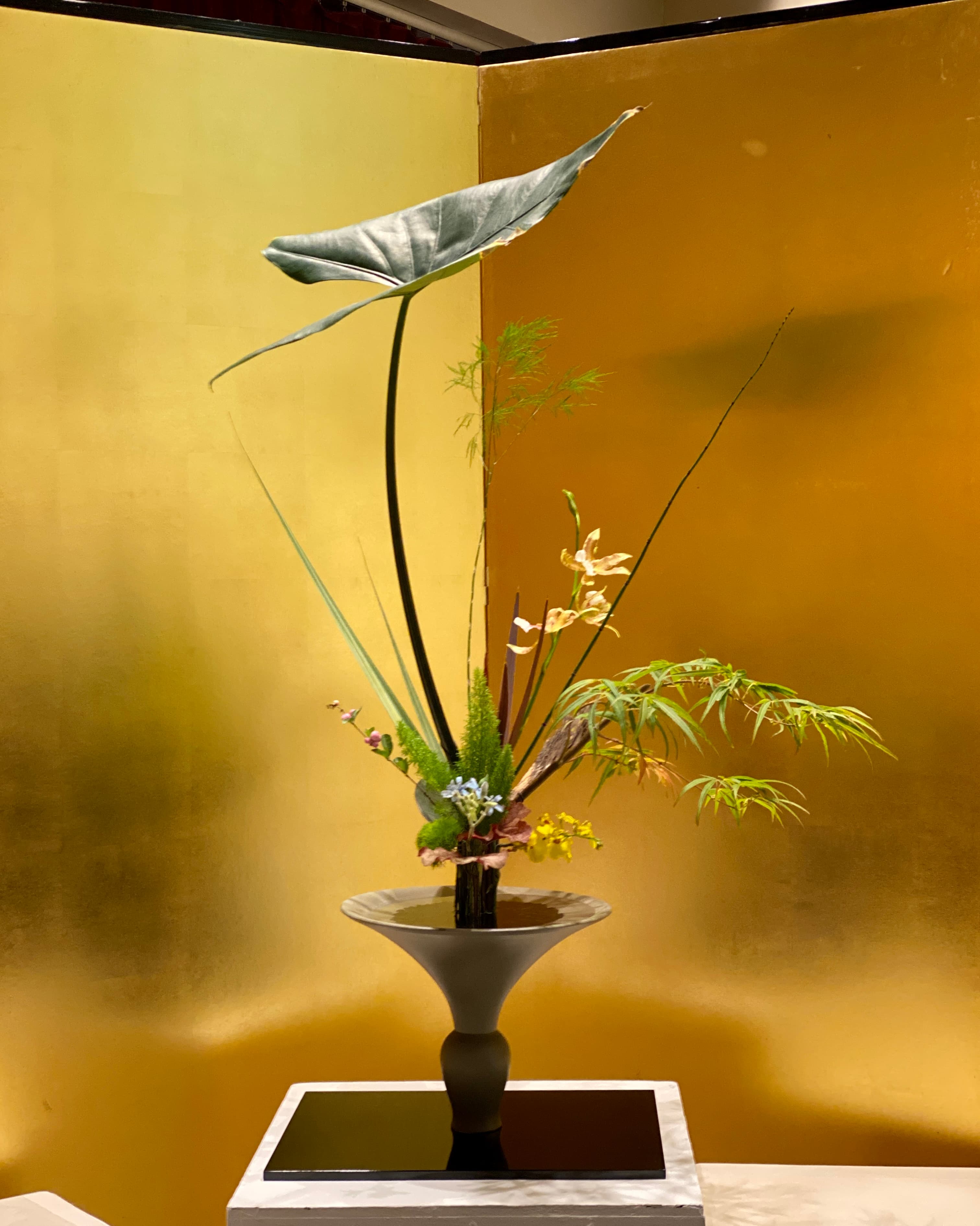 Présentation d’ikebana par les membres d’Ikebana International Paris appartenant aux trois écoles suivantes : l’école Ikenobo, la plus ancienne, qui repose sur un enseignement de règles strictes et traditionnelles ; l’école Ohara, basée sur une observation de la nature très réaliste ; l’école Sogetsu qui suit une philosophie free-style et parfois avant-gardiste.