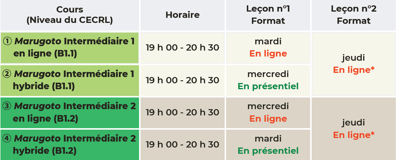 - Marugoto Intermediate 2 (B1) pour les cours ③④ Marugoto Intermédiaire 2* (thèmes abordés : T1, T2, T3 et T4).