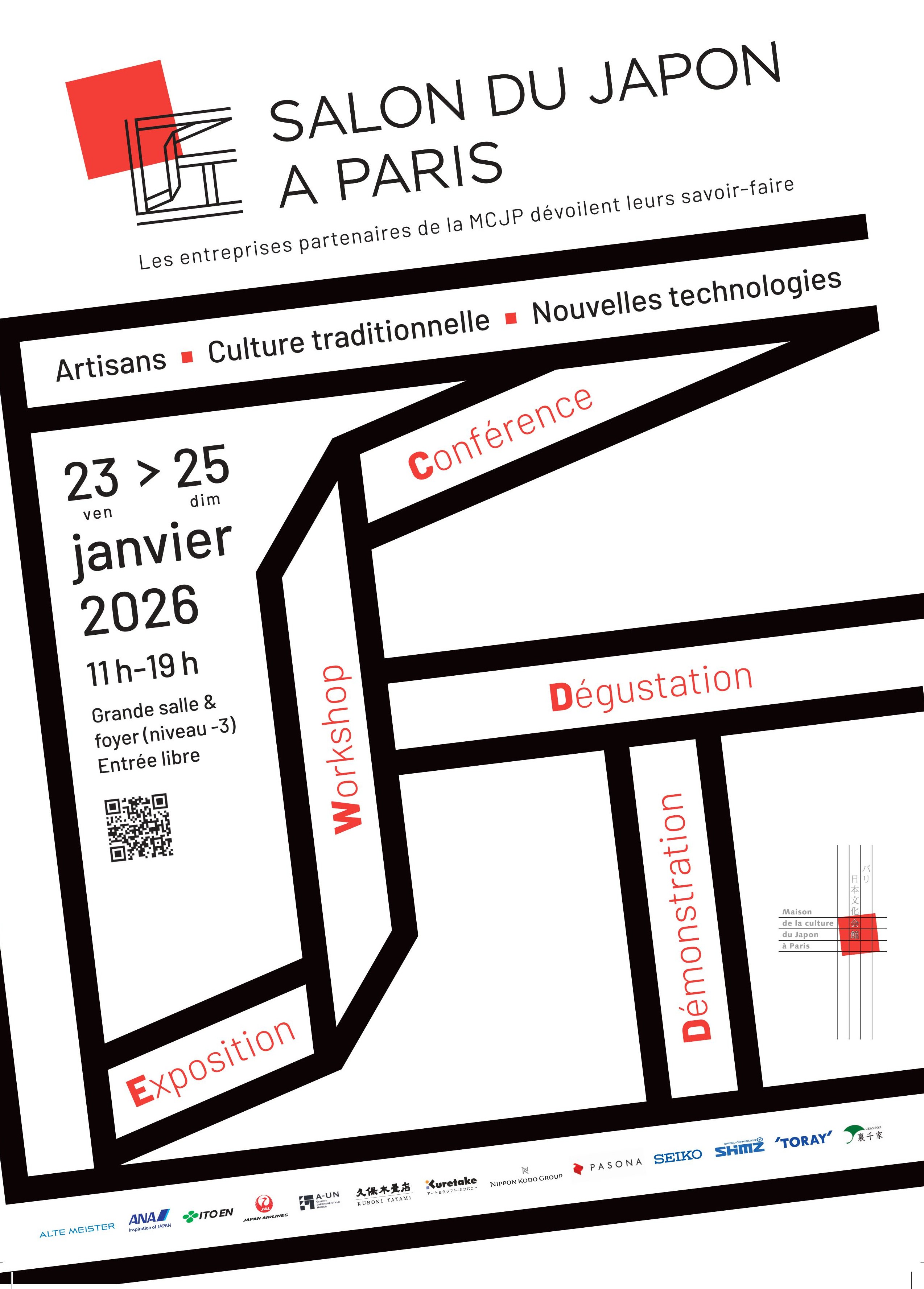 Artisanats, culture traditionnelle et nouvelles technologies… Les entreprises japonaises vous présentent leurs savoir-faire. Ce nouveau salon réunit les entreprises qui soutiennent les activités de la MCJP. La réalisation de leurs produits ou de leurs services mobilise des savoir-faire traditionnels et/ou des technologies récentes. Grâce à ce salon, vous découvrirez la culture japonaise par le prisme de ses entreprises !